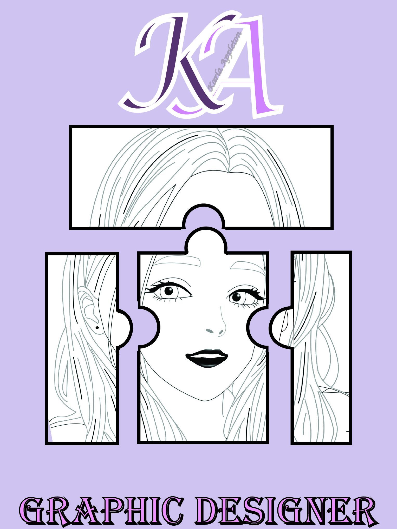 As this is a Self-Promotional poster two ideas have been brought together to create a better understanding of my interests, as well as what type of Graphic Designer I hope to be in the future. the black and white Photoshop portrait was used and split into four sections. It was kept black and white to represent a manga style. The four sections are also used to represent this as manga templates are always split into sections. These sections have been made into a jigsaw puzzle; this is also a representation of my interest in challenges like you would find in a difficult puzzle. the lilac background gives a calming and feminine aesthetic, and the pink and purple Typographical logo works with the poster as the blend so well with the background colour, while still having enough difference to stand out. The bold Serif font for the “Graphic Design” is pleasing on the eye and easy to read with the black outline.