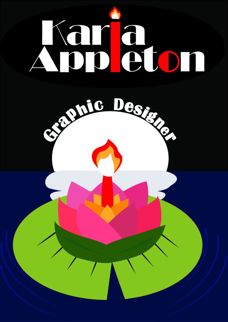 A Chinese and Japanese theme is used for this poster. This is represented by the use of a lotus flower, a well-known water plant in Asia. The conceptual candle personal logo has also been used to continue the spiritual essence that the lotus candle creates. Lotus candles are symbolic in Buddhism, symbolizing wisdom and spiritual purity but can also be used to symbolize mental health. The reason for the Chinese and Japanese theme is because of my interest in animation and manga as they are both incredibly popular in those countries. Throughout the poster I have chosen colours that are aesthetically pleasing and give off a warm feeling. the “Graphic Designer” has been made white and placed around the rising moon to look like beams, this also ties in with the moonlight reflection in the water. The white chosen for these continues from the logo and gives the best contrast to the candle flame and merges the divide between the text and image halves.