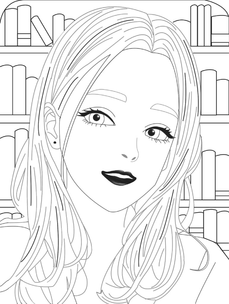 For this portrait I have used greyscale to create a black and white image, this is to give it a sketched effect like you would see in a manga. It was made by using the pen tool, and stroking the paths made, along with various selection tools, and a bit of brush work. An animation style can be seen with the large eyes, pointed chin and smaller facial features which is a popular anime style. I have gone with a gothic look for the eyes and lips, which works well with the black and white effect, this creates a bold and more eye-catching image. A background of books was added to fill in the blank space behind the portrait. This is also for my interest in book/manga, which is one of my biggest personal hobbies and major inspiration in me pursuing my career.