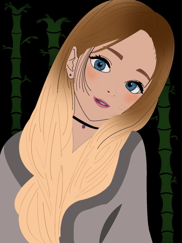 This portrait has a lot more detail than the others and is also an animation style. It is an evolution for the first Photoshop portrait, going from the black and white images you would see on a manga page to a full colour piece you would find either on the cover or an anime. This was made by using the pen tool, lots of selection work using the magic wand and other various tools. It has more intricate brush work mixed with blurring and smudging to create more realistic lips and irises. The bamboo in the background as well as the kimono clothes were chosen with a Japanese inspiration in mind. The extra detail added to this portrait gives it a more realistic aspect and pleasing result.